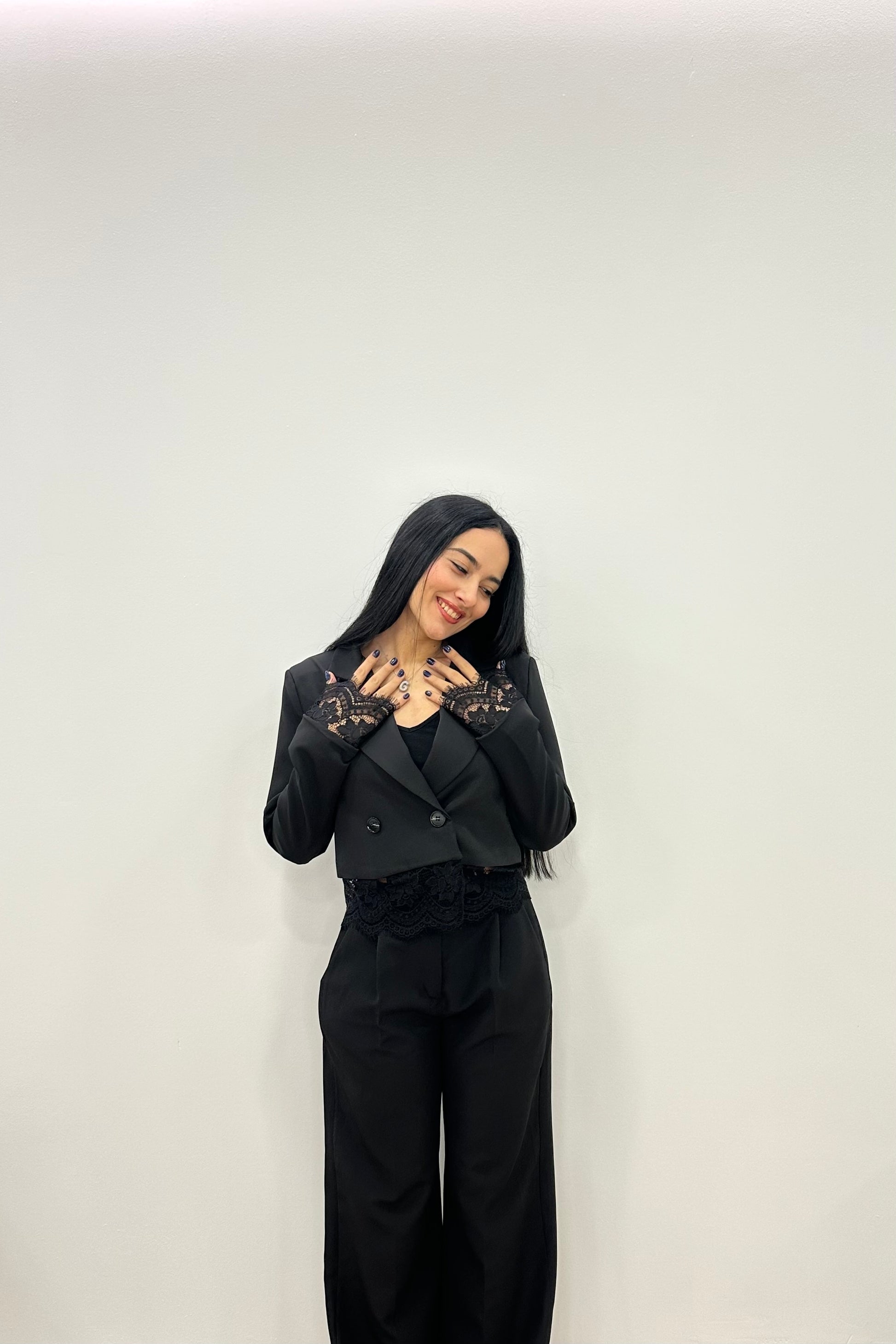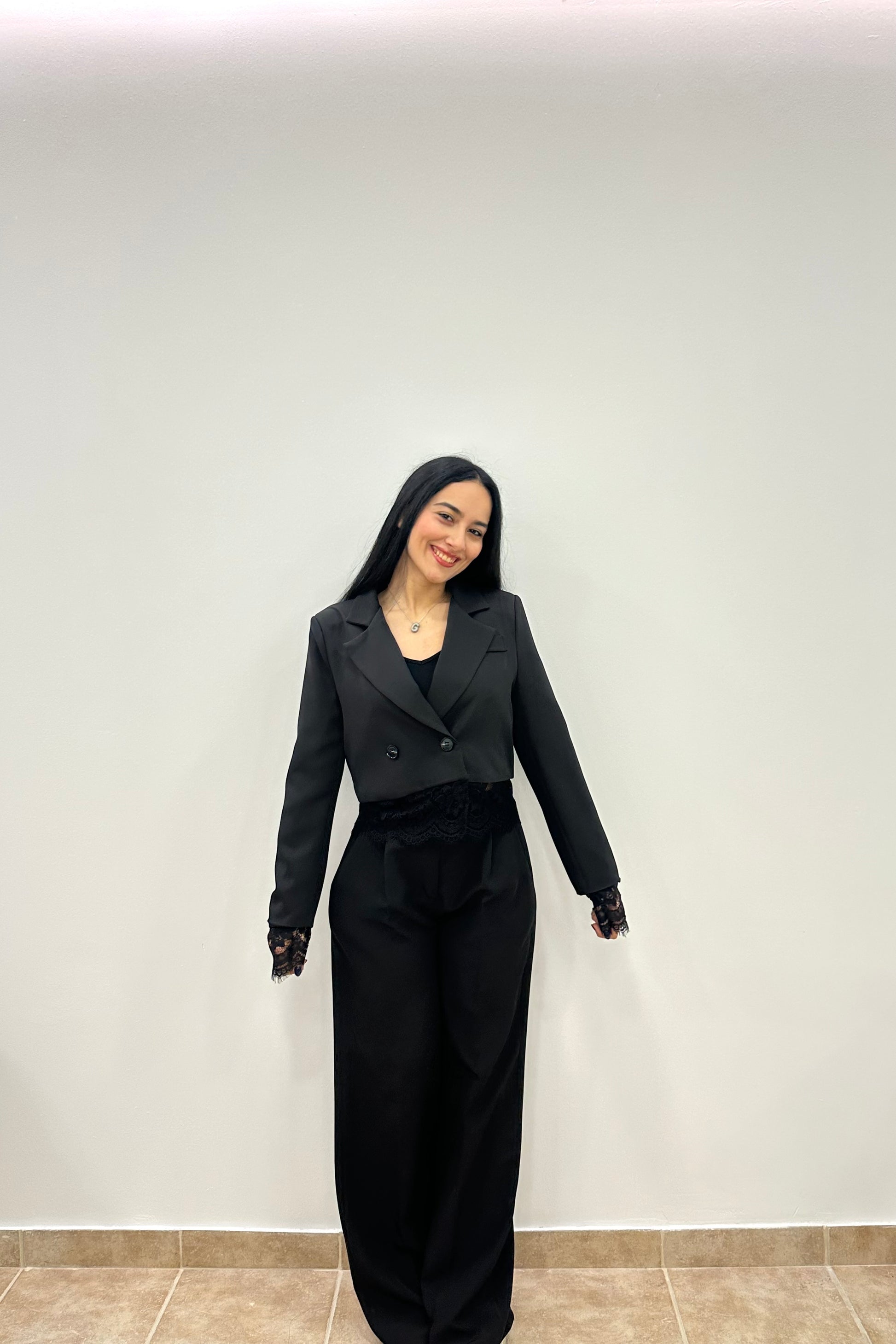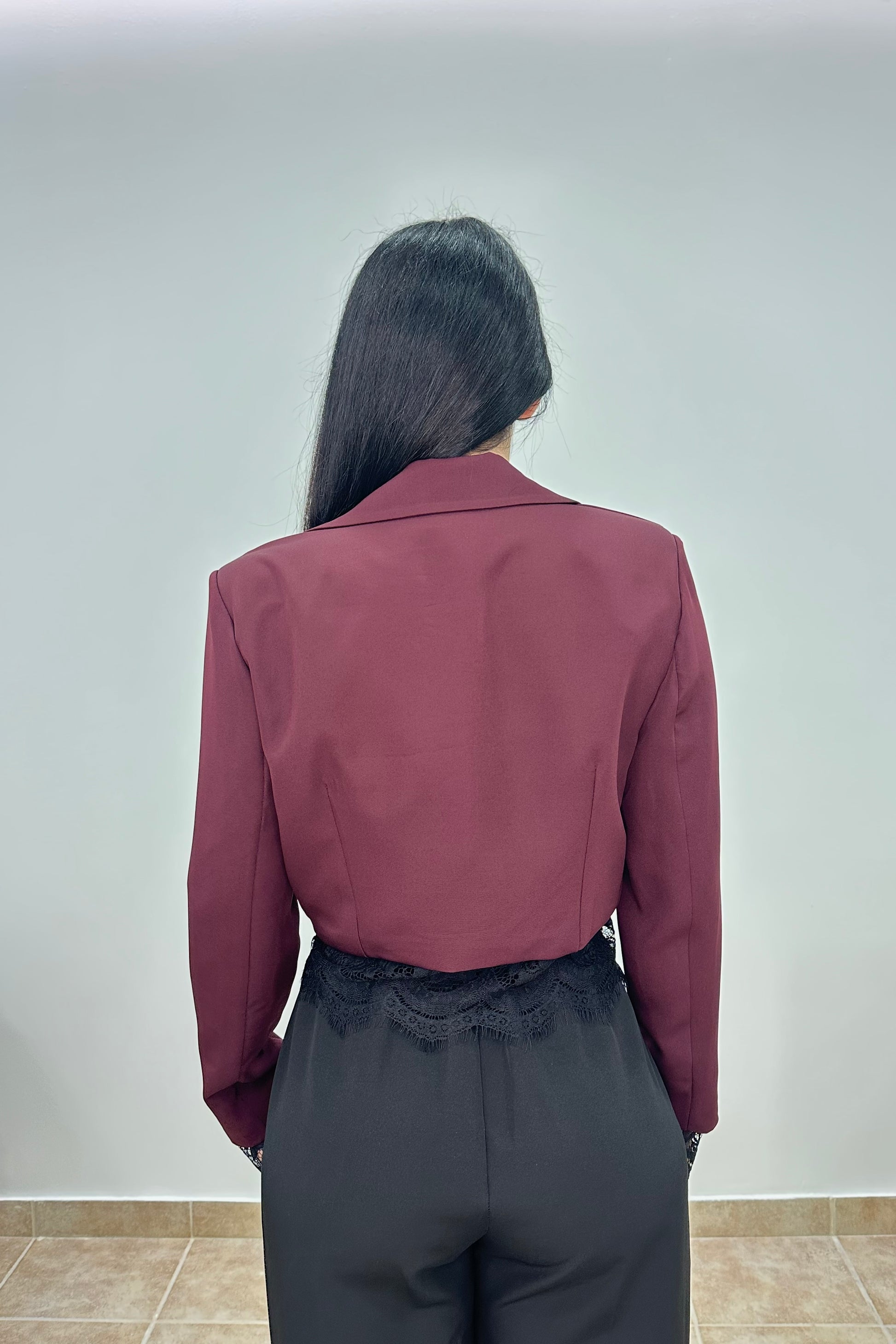 Κομψό cropped σακάκι σε βαθιά μπορντό και μαύρη απόχρωση, που συνδυάζει δυναμισμό και θηλυκότητα. Διαθέτει διπλό κούμπωμα και εντυπωσιακές λεπτομέρειες δαντέλας τόσο στο τελείωμα όσο και στα μανίκια, προσδίδοντας μία elegant και ιδιαίτερη αισθητική.
