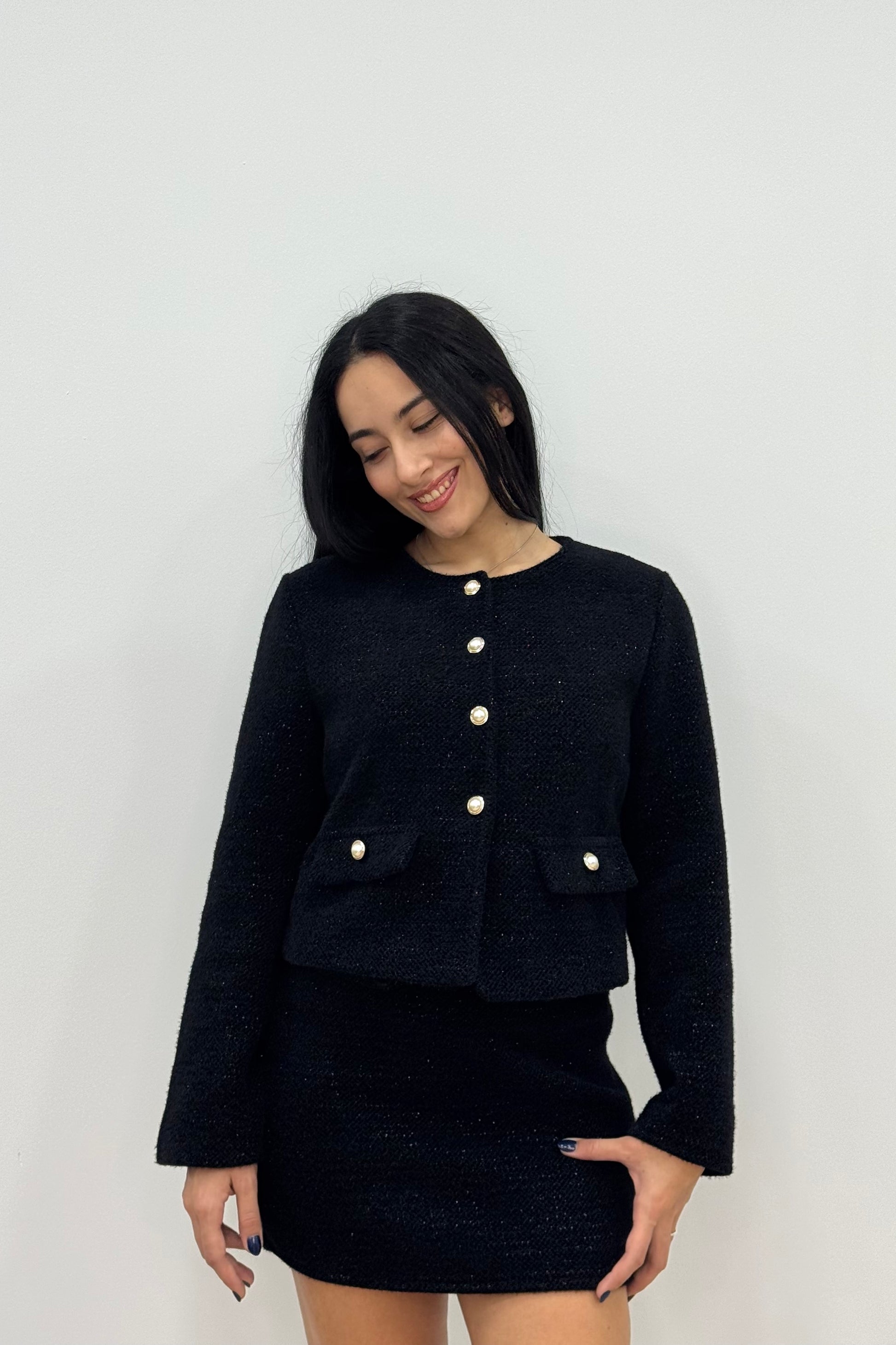 Κλασική μαύρη ζακέτα σε ανάγλυφη πλέξη. Ένα διαχρονικό κομμάτι με στρογγυλή λαιμόκοψη και εντυπωσιακά κουμπιά-πέρλες που δίνουν λάμψη σε κάθε σου εμφάνιση.