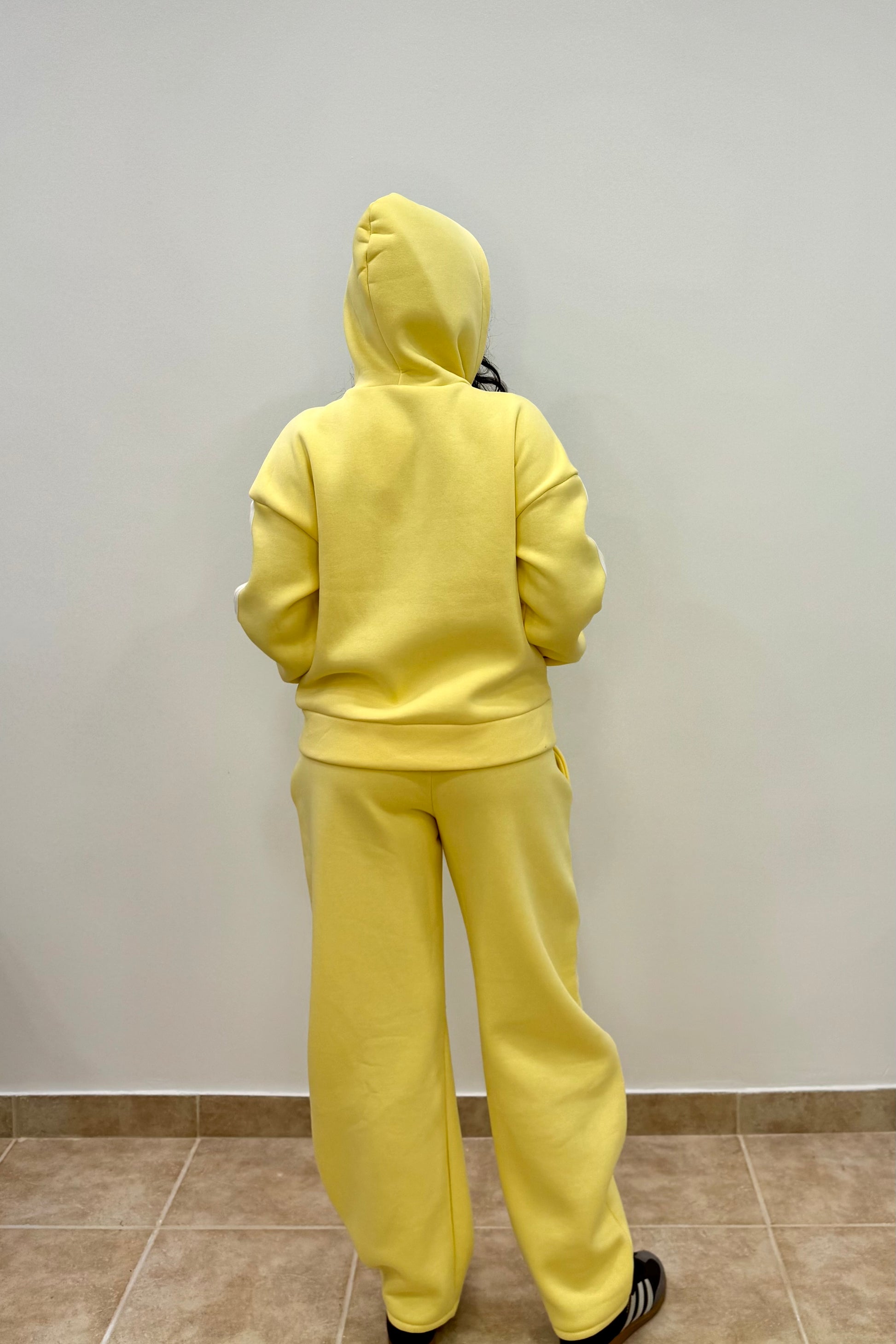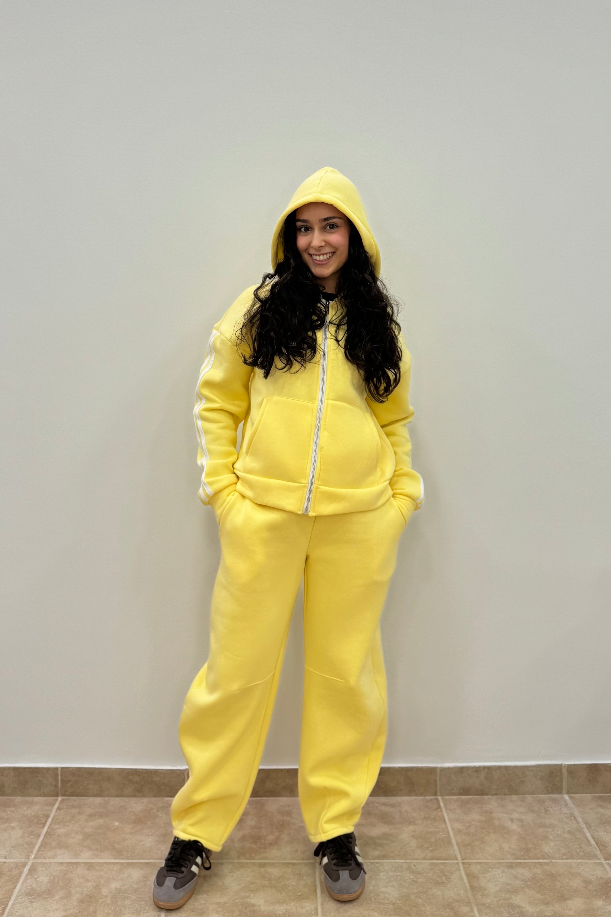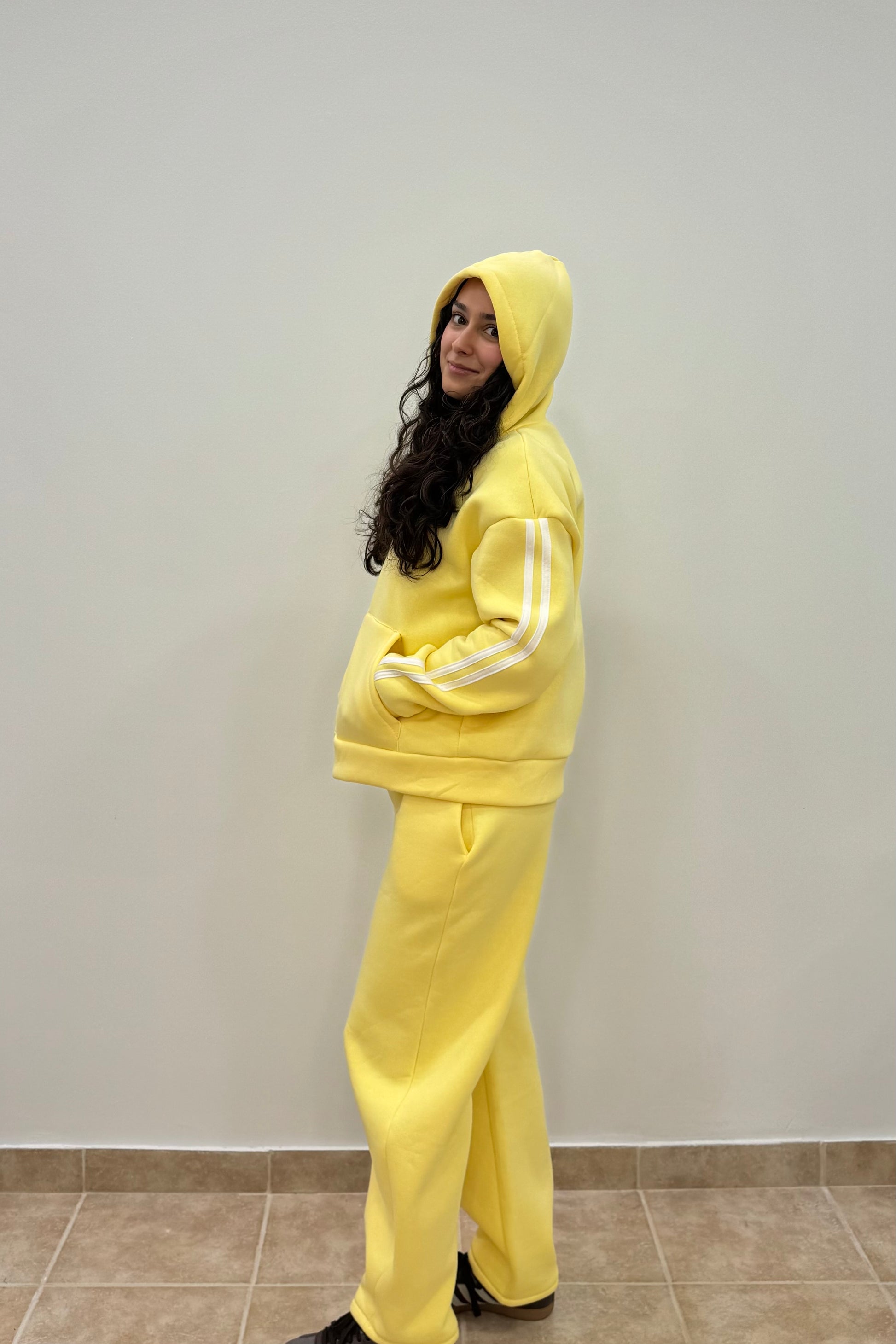 Ένα total yellow sporty look που αποπνέει άνεση και θετική ενέργεια. Το σύνολο αποτελείται από φαρδύ φούτερ με κουκούλα σε έντονο κίτρινο χρώμα, με διακριτικές λευκές ρίγες στα μανίκια, και matching φόρμα σε ίσια γραμμή.
